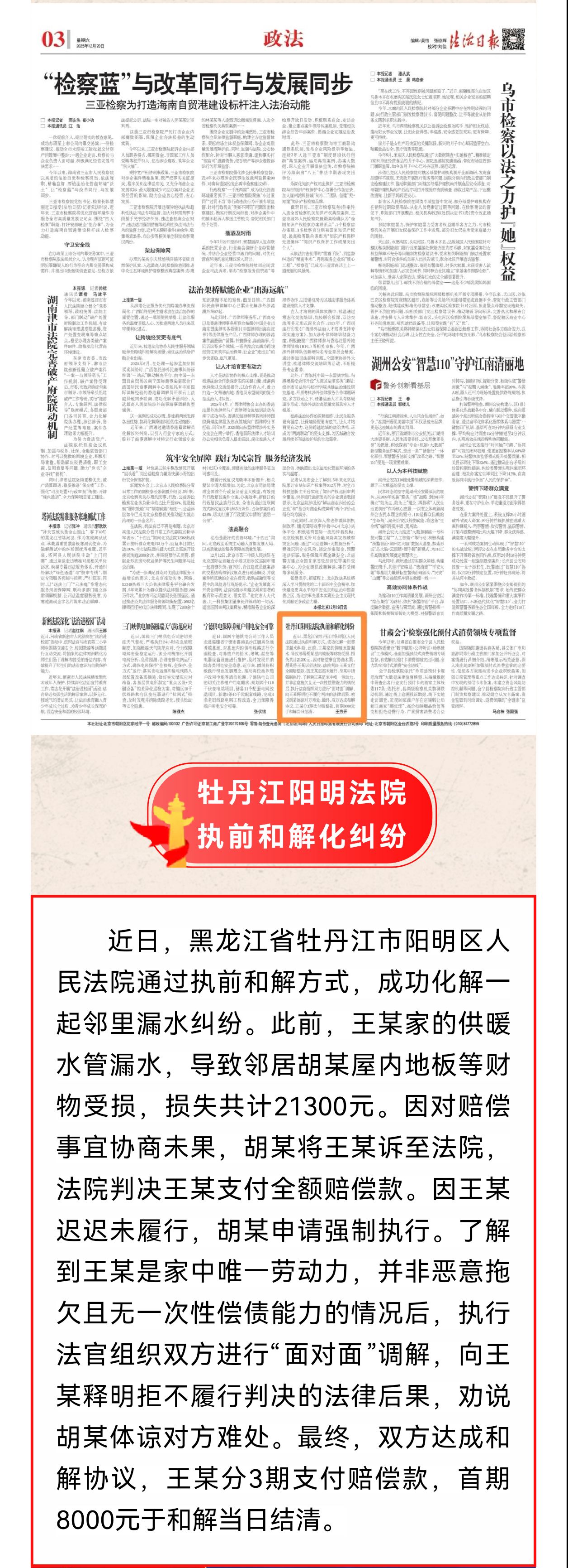 【喜报】《法治日报》刊登牡丹江市阳明区人民法院执前和解化纠纷